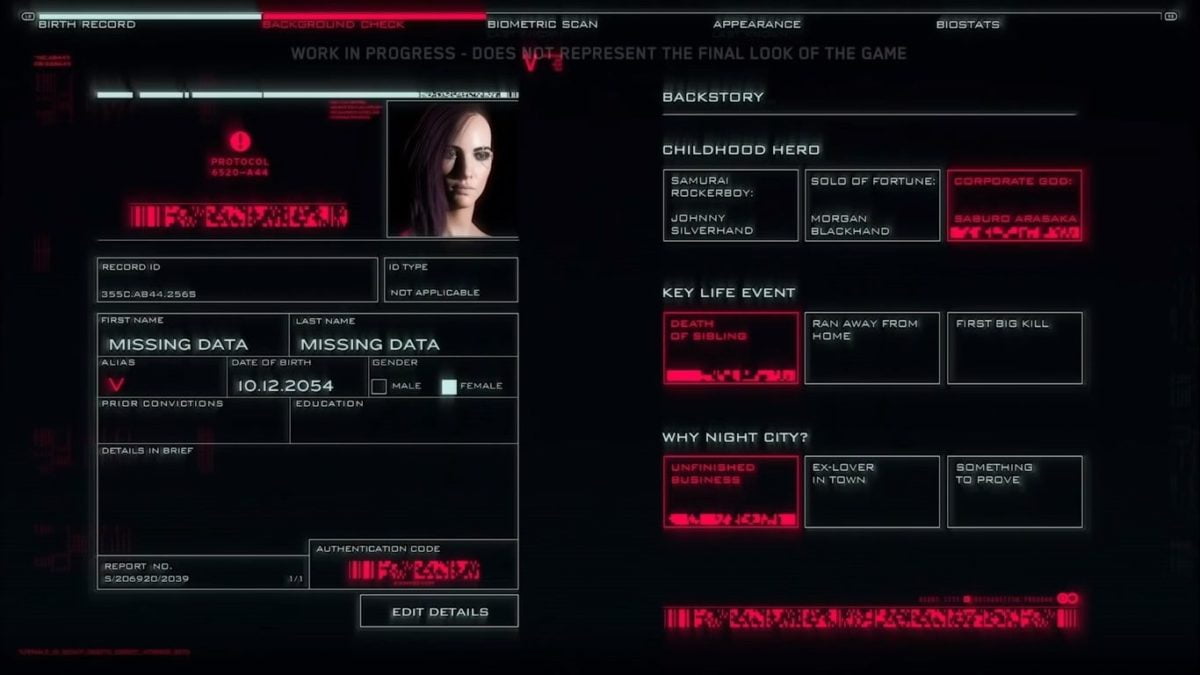 Mesmo sendo em primeira pessoa, o CD Projekt Red confirmou no Twitter que seu personagem criado será visível durante as cut-scenes. O conjunto de criações também permitirá que os jogadores personalizem totalmente seu personagem único com seções específicas, incluindo registro de nascimento, verificação de antecedentes, varredura biométrica, aparência e bioestatos. Ele permitirá que você escolha a história de fundo e o principal evento de vida de seu personagem, além de criar o rosto desejado. De um olhar superficial, certamente parece fazer justiça ao material de origem da mesa.