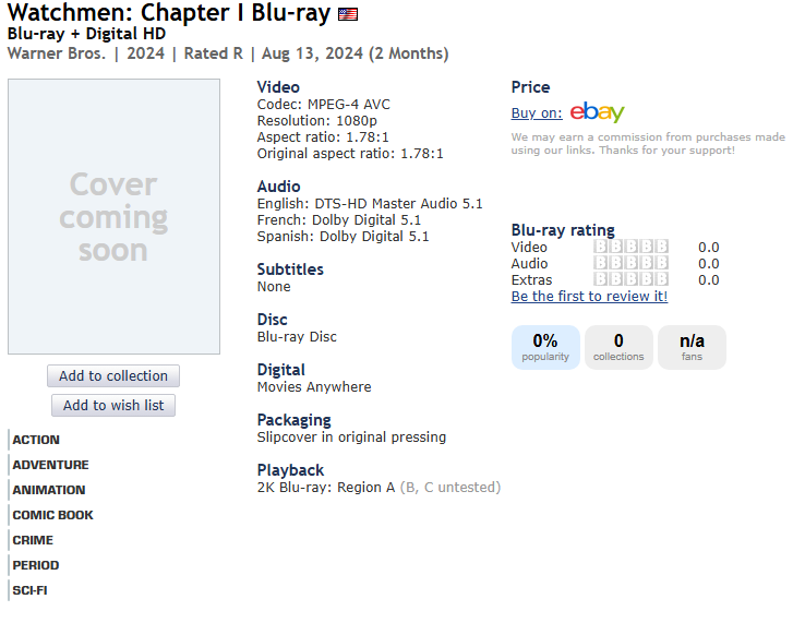 Como listado na imagem, o produto foi catalogado como Watchmen: Capítulo 1, aumentando a possibilidade da obra ser dividida em duas partes. Embora seja um projeto animado, o filme é classificado com Rated-R, ou seja, para maiores de 18 anos.