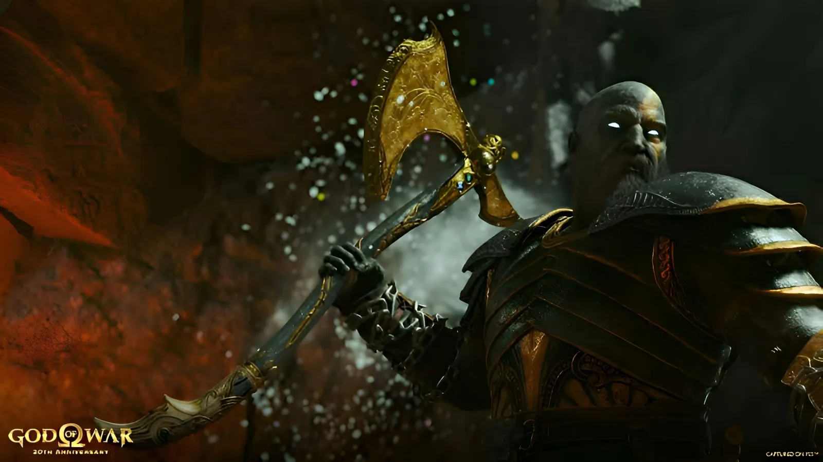 “Inspirados no nome provisório de God of War (2005) e na skin que apareceu originalmente em God of War II como recompensa por terminar o jogo na dificuldade Modo Deus, estamos trazendo o tema clássico preto e dourado para o 20º aniversário.”