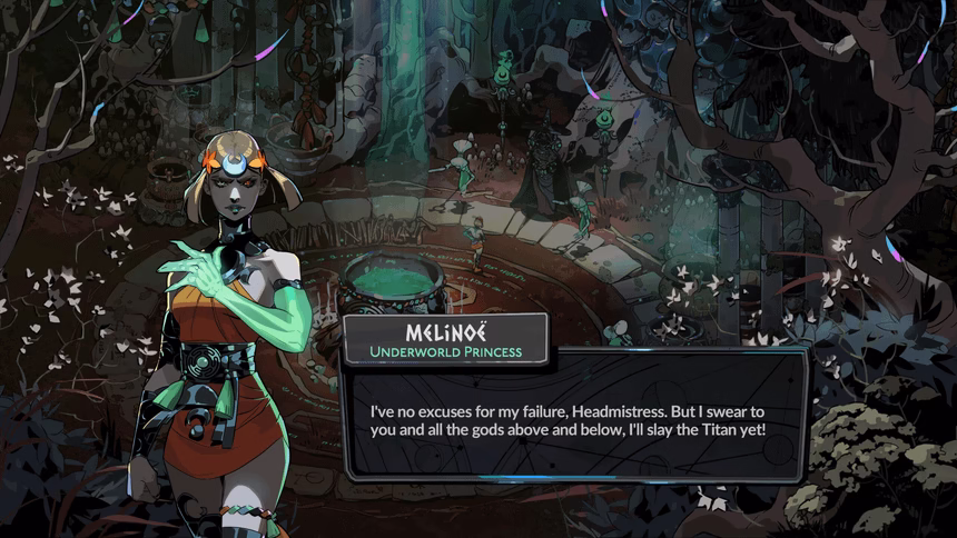Nele, você controla Melinoë, filha de Hades e irmã de Zagreus, a princesa imortal do Submundo, que usa feitiçaria sombria para batalhar contra o Titã do Tempo, Cronos, em um mundo mítico grego expandido, com combate rápido, progressão roguelike, diálogos afiados e alta rejogabilidade.