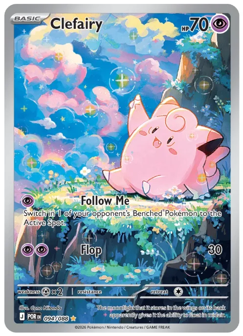 Uma das cartas mais comentadas desta revelação exclusiva é, sem dúvida, a Clefairy #86, em sua versão Illustration Rare (IR). A arte desta carta é descrita como uma das mais adoráveis já produzidas para o Pokémon TCG. Ela captura um grupo de Clefairys dançando sob a luz da lua cheia, mantendo a tradição do folclore Pokémon que envolve este personagem místico.